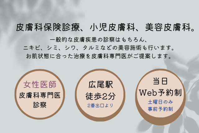 | 特徴 | ・女性医師の皮膚科専門医が診察。 ・保険診療メインのクリニック。 ・広尾駅から徒歩1分。 ・美容皮膚科まで幅広いメニュー。 |