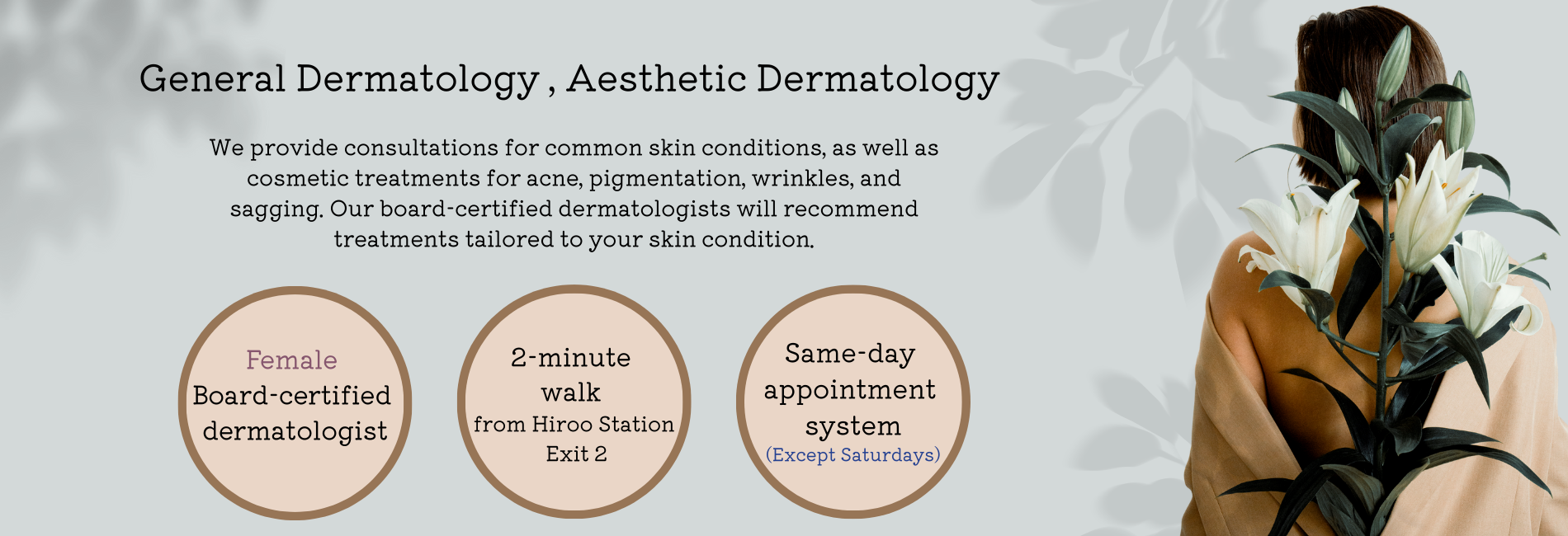 | Features | ・Consultations by female dermatologists with specialist expertise ・Clinic mainly providing insurance-covered treatments ・Conveniently located just a 1-minute walk from Hiroo Station ・Wide range of services, including cosmetic dermatology |