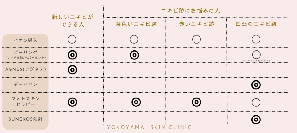 ニキビ症状に合わせた自費治療・一覧表