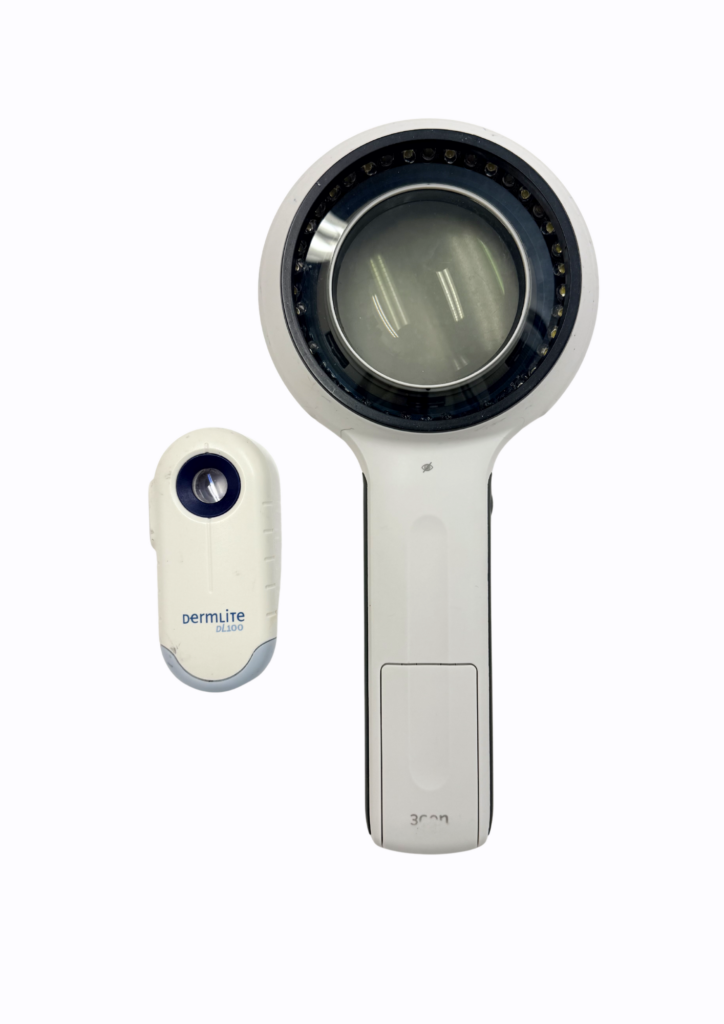 皮膚科の診療で使用する特殊な拡大鏡です。皮膚病変の形状、色、血管の性状などを調べ、良性か悪性かを判断します。
