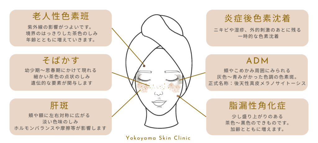 当院では、医師による丁寧な診察のもと、それぞれのしみの種類や肌状態を見極めたうえで、適切な治療と日々のスキンケアをご提案いたします。さらに、しみだけでなく、赤み・小じわ・毛穴なども含めた総合的な視点から、お一人おひとりの肌に寄り添った治療を行っています。